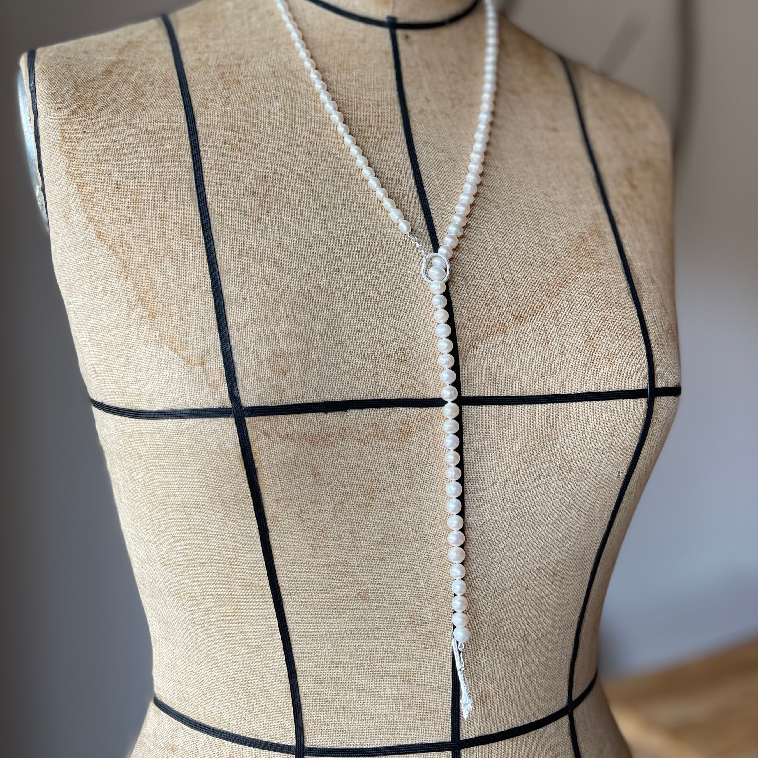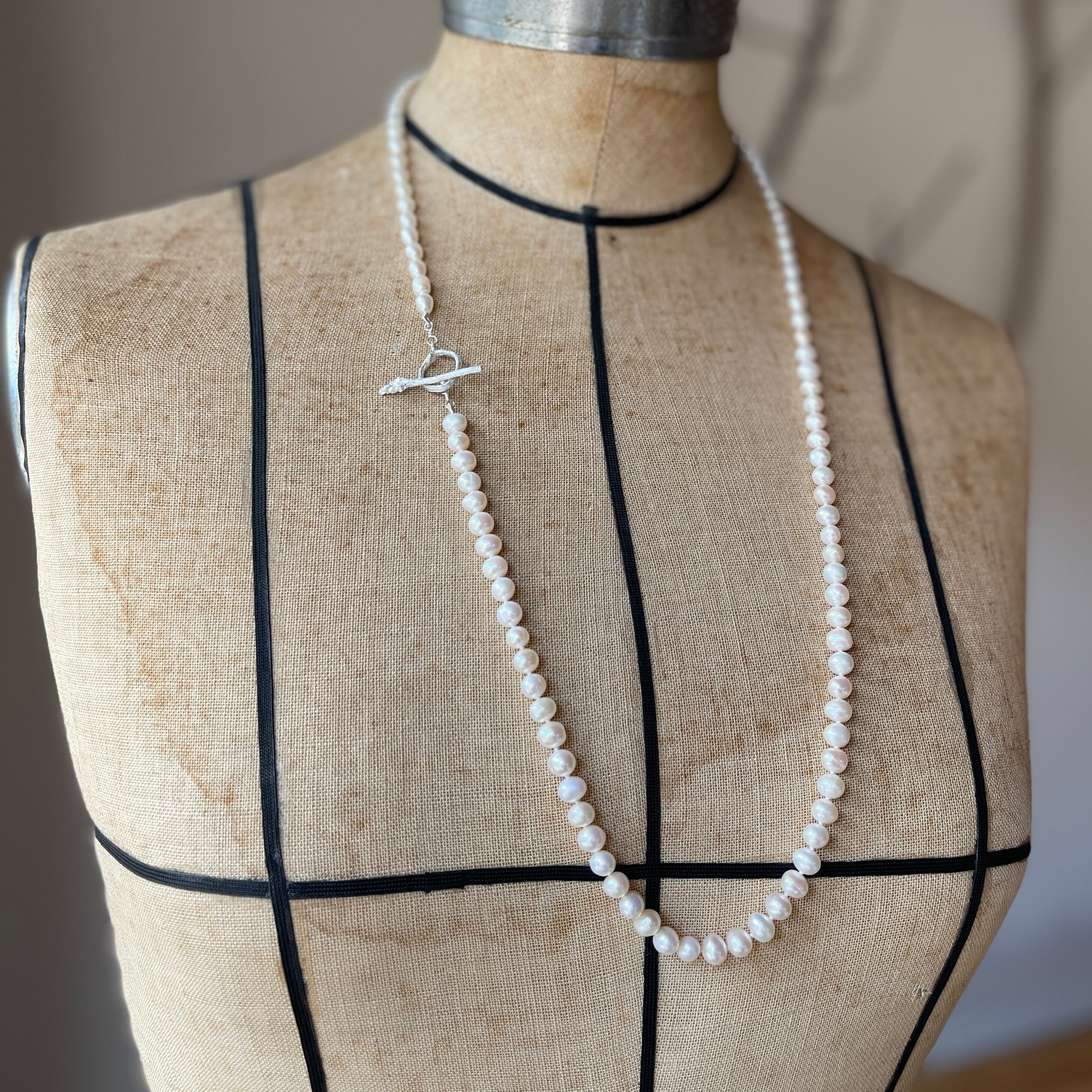 2種類のサイズの違う淡水パールを組み合わせ、パールとパールの間はひとつひとつ結び目を作るノット仕上げのネックレスです。