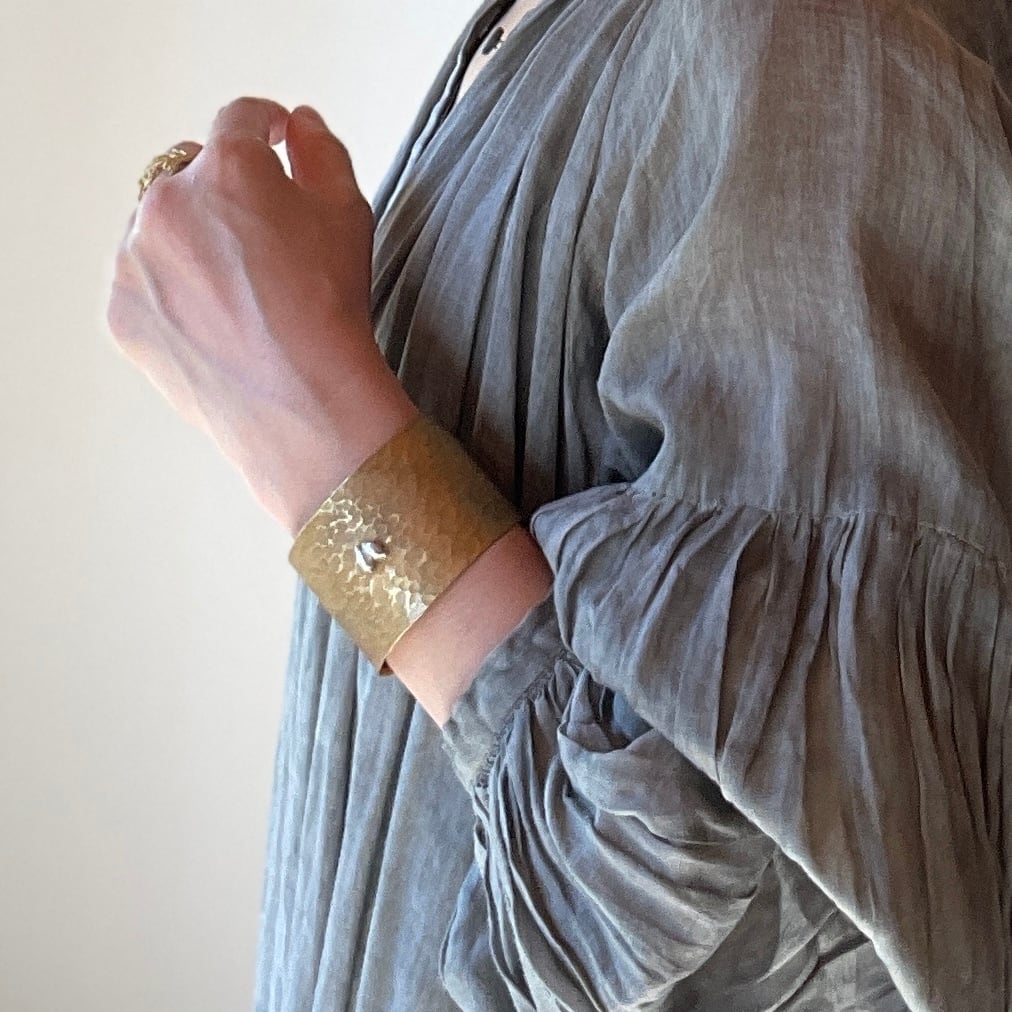 シルバーのビバーナムの実をポイントにあしらった、真鍮製の幅広バングル。
