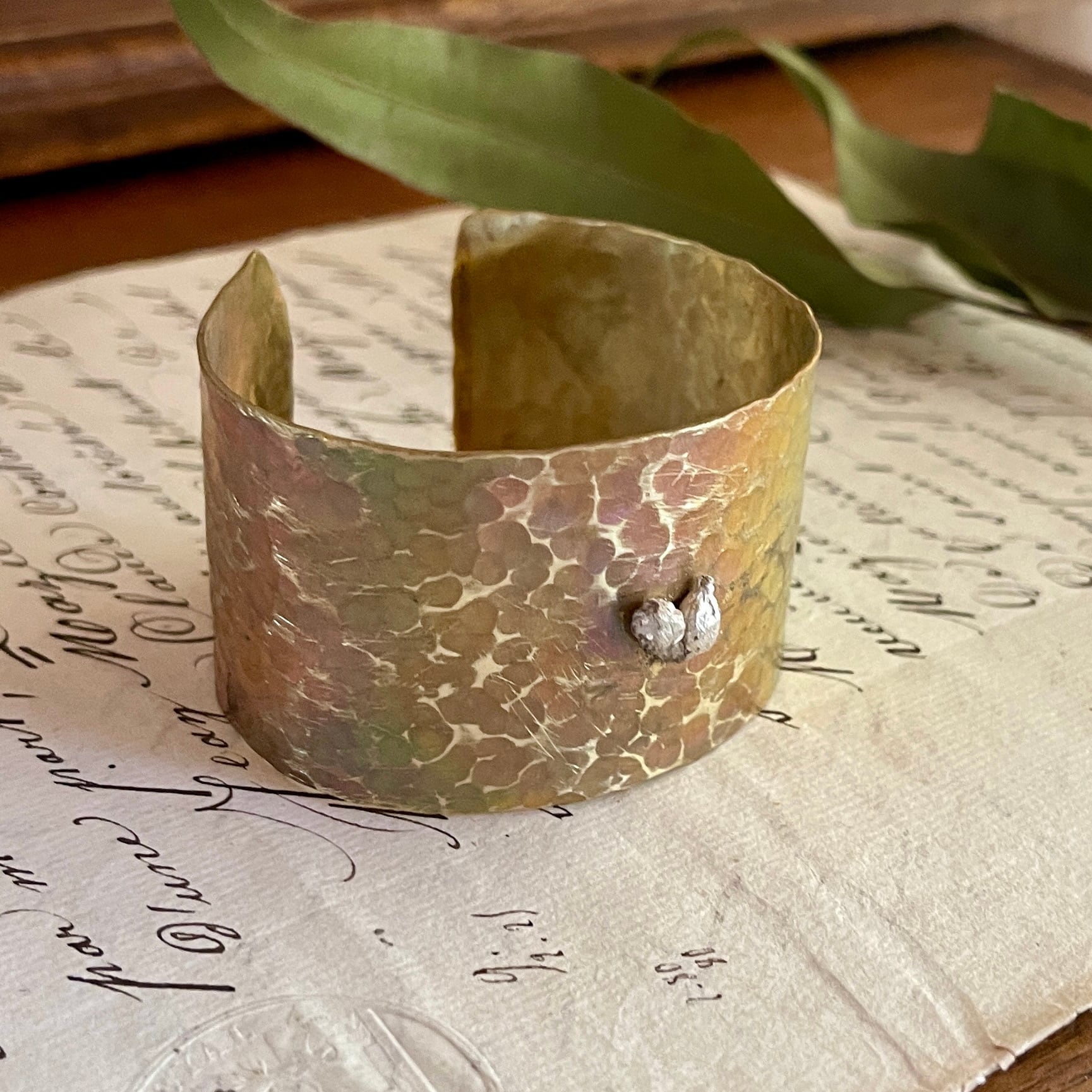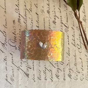 シルバーのビバーナムの実をポイントにあしらった、真鍮製の幅広バングル。
