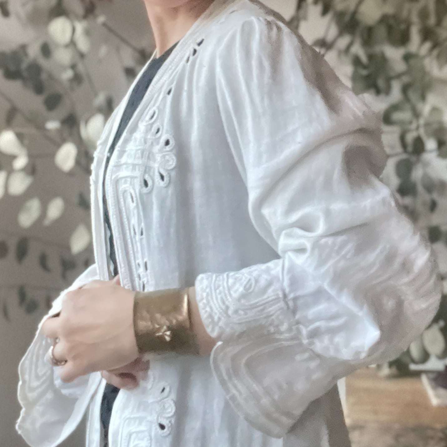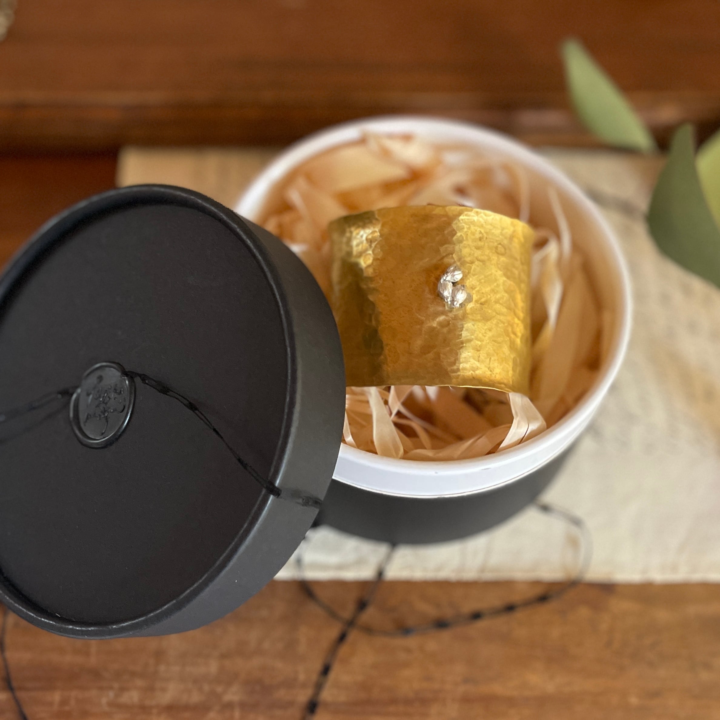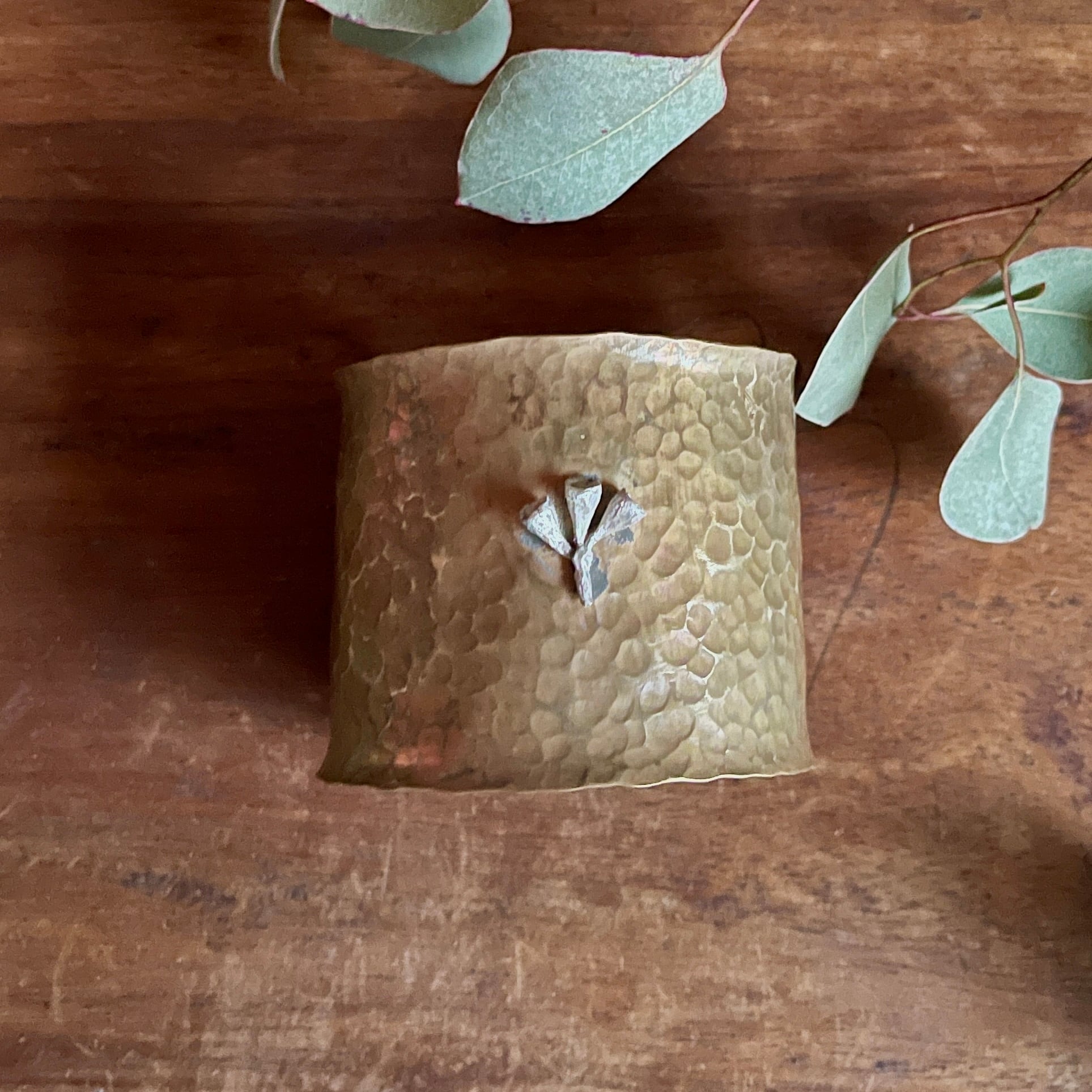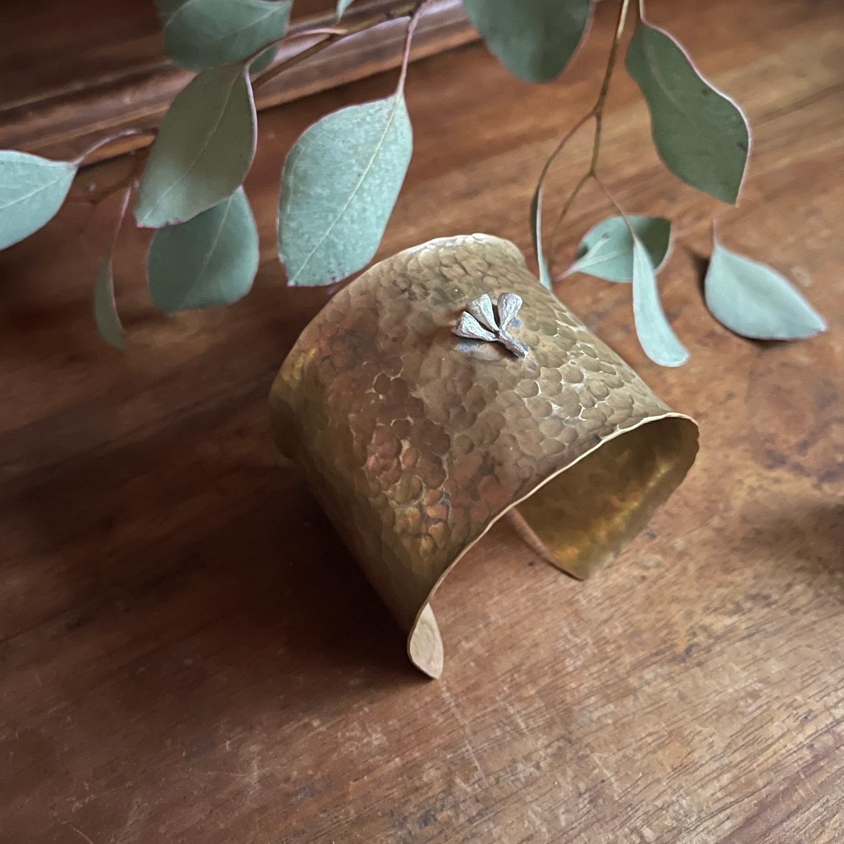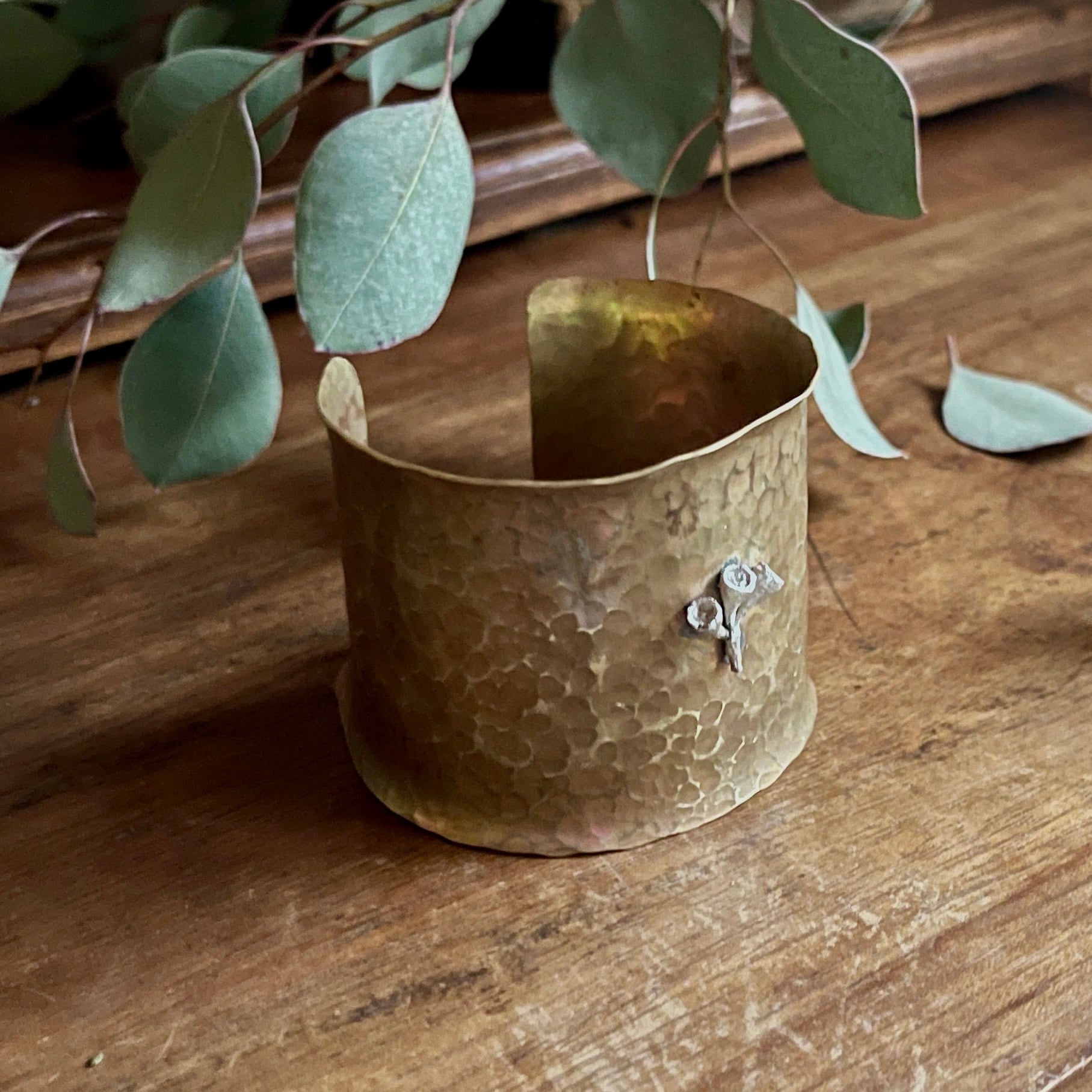 シルバーのユーカリの実をポイントにあしらった、真鍮製の幅広バングル。