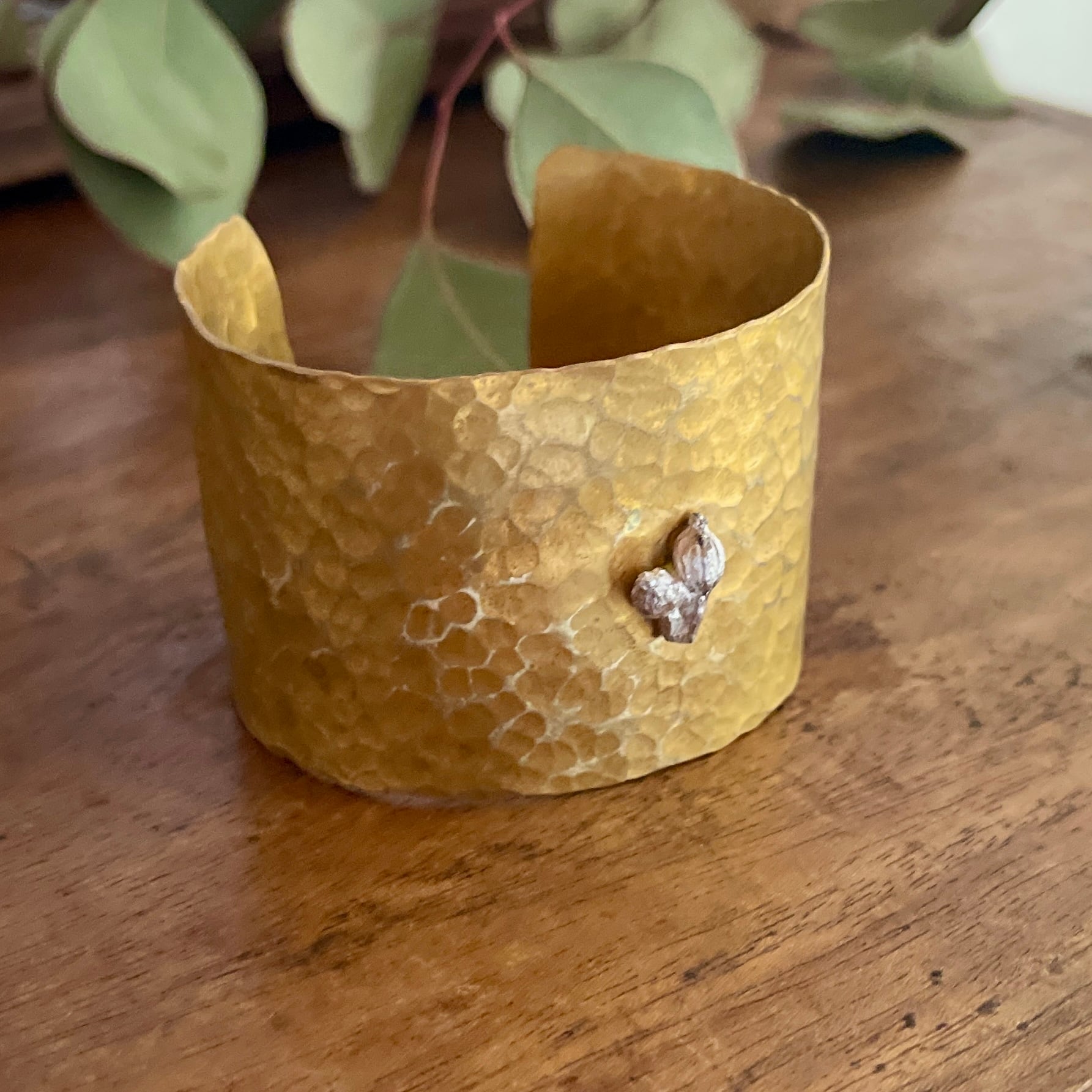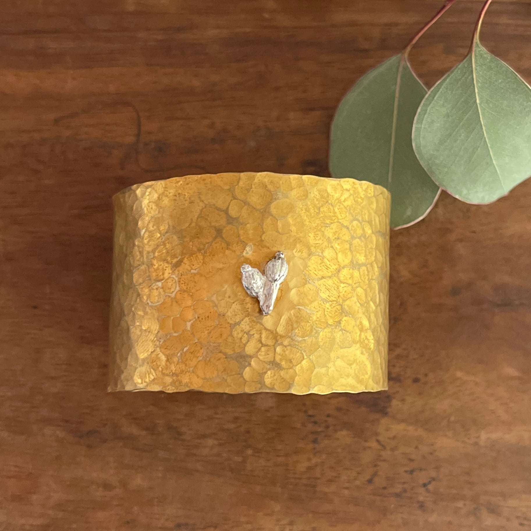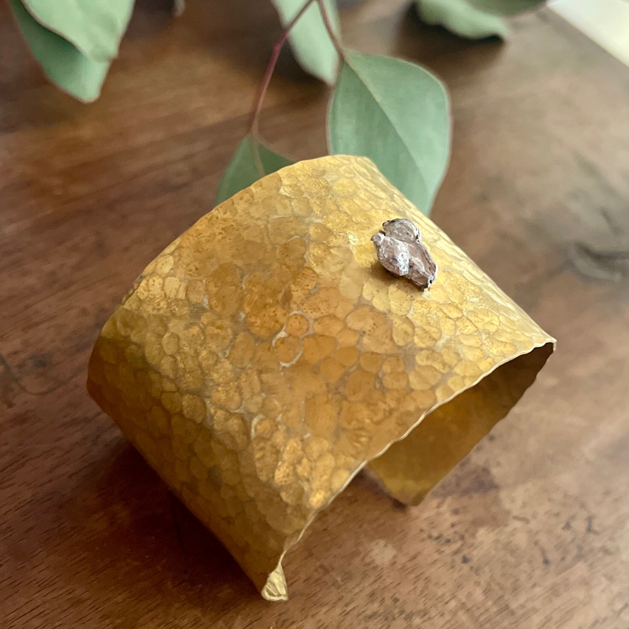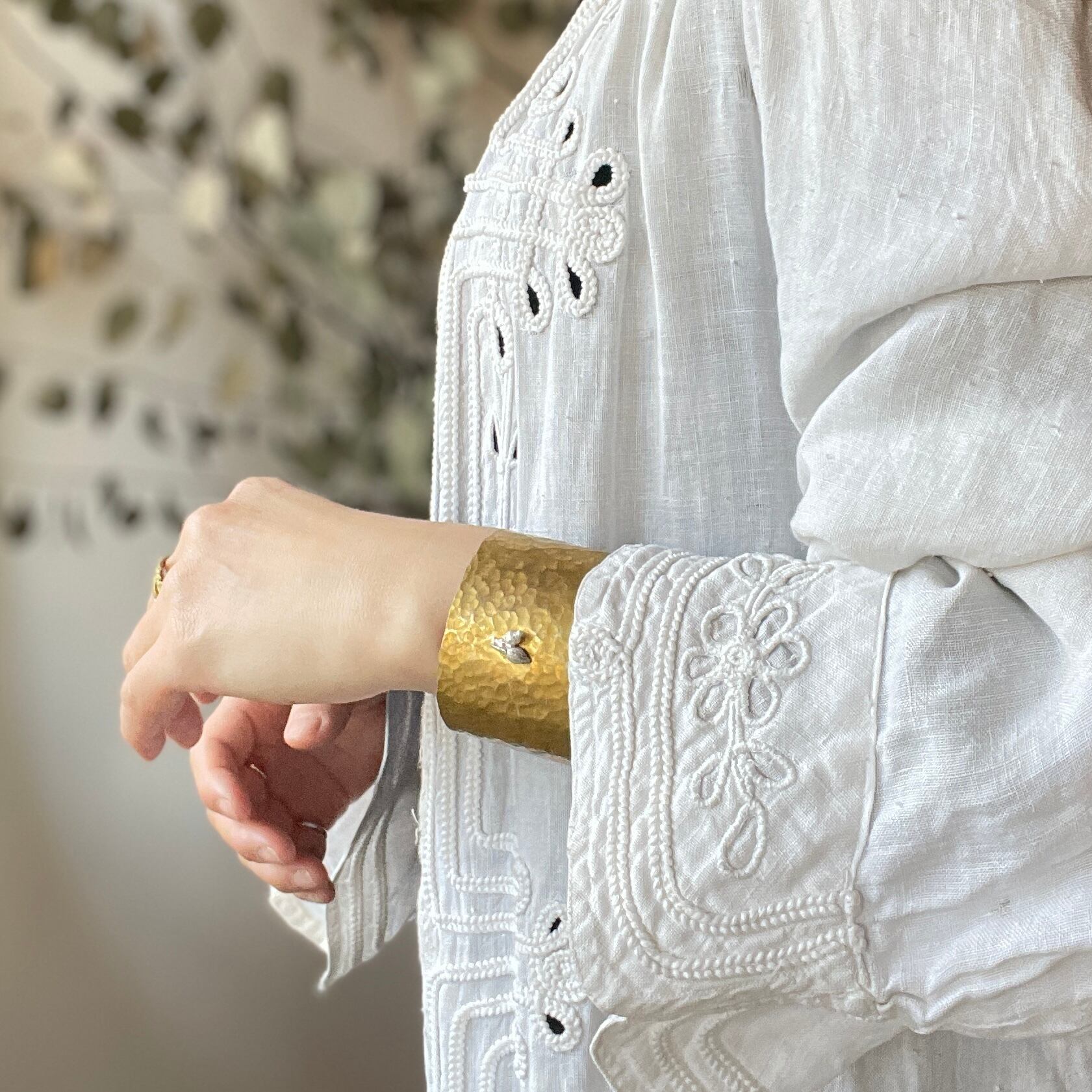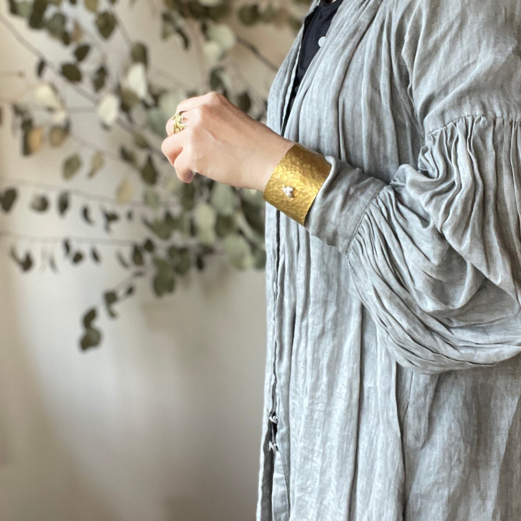シルバーのビバーナムの実をポイントにあしらった、真鍮製の幅広バングル。 ややマットな質感の真鍮が肌になじみ、どんな装いにも自然に溶け込みます。 植物の繊細な造形と、金属の重厚感が調和したデザイン。 経年変化も楽しめる一点です。 サイズ:幅約4cm 内径約5.5cm 素材:brass 実silver925 こちらは磨きすぎない程度に磨いてあります ※金属アレルギーにご注意ください。