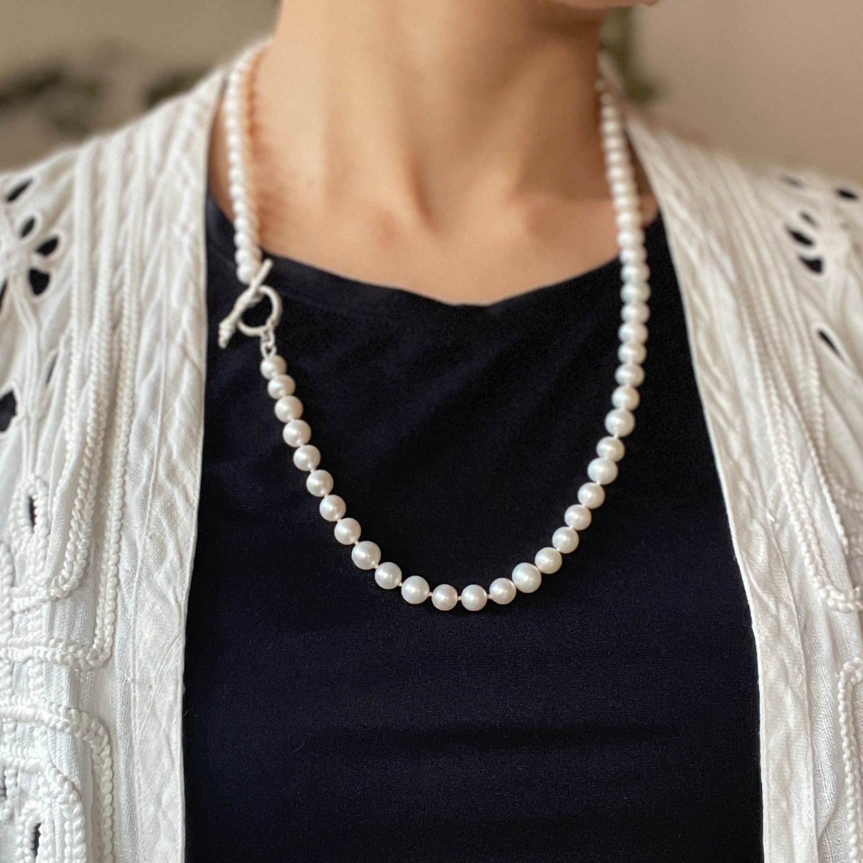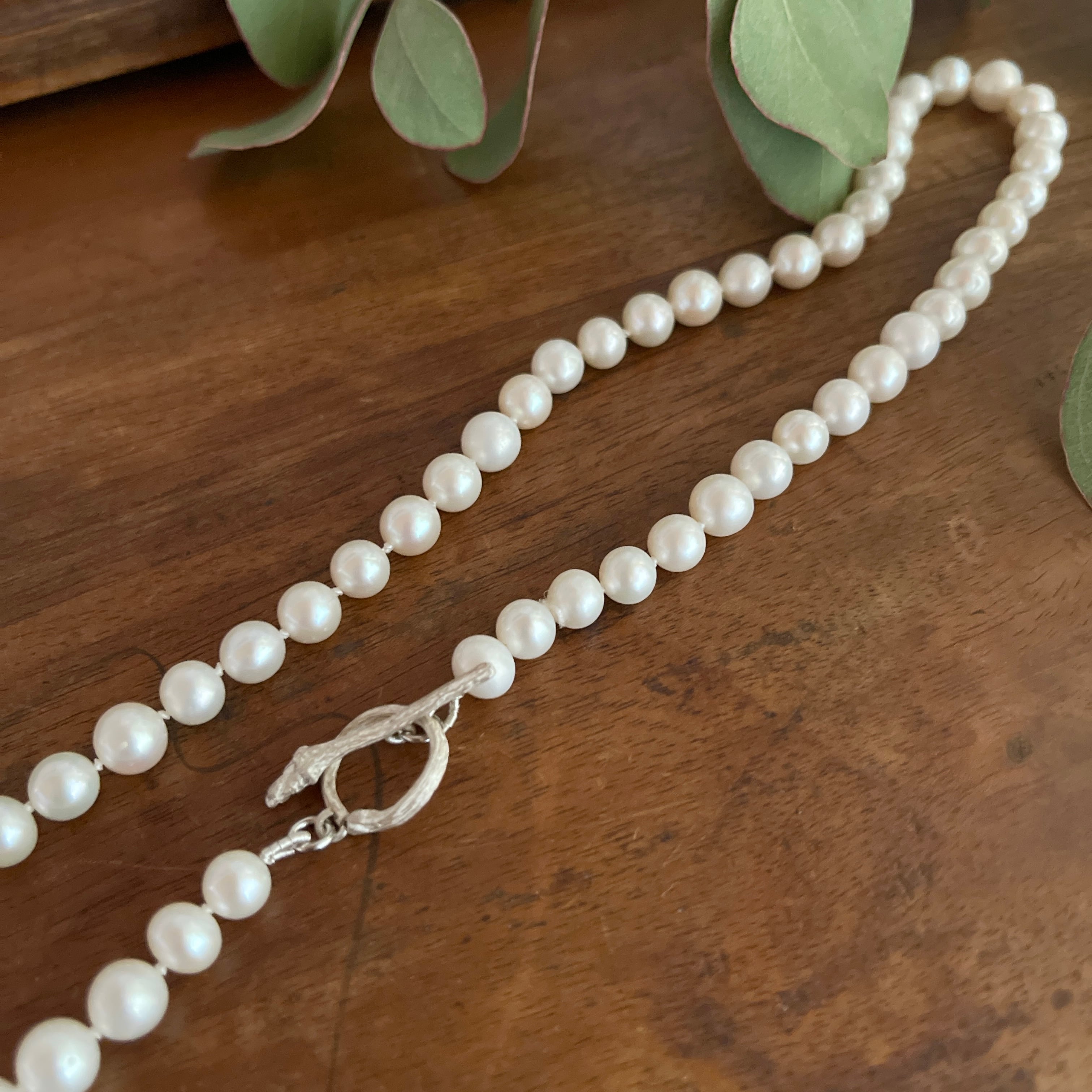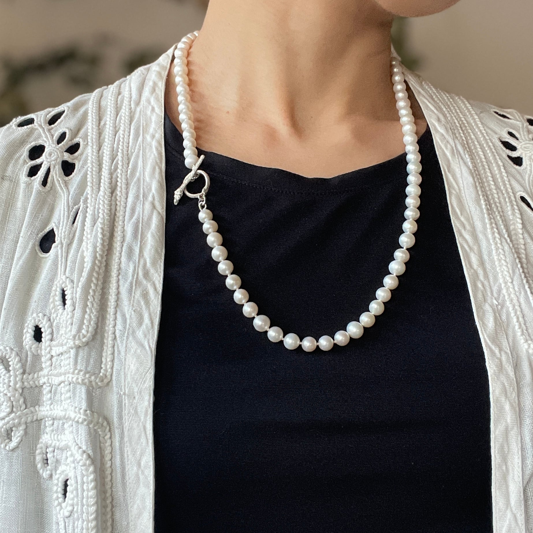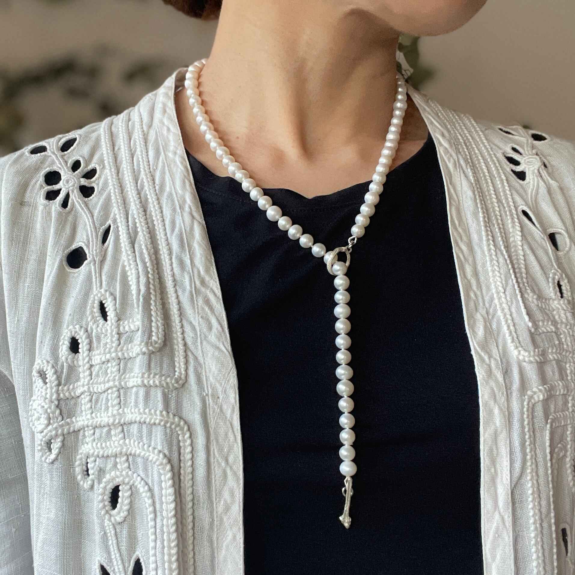 パールとパールの間はひとつひとつ結び目を作るノット仕上げのネックレスです。
