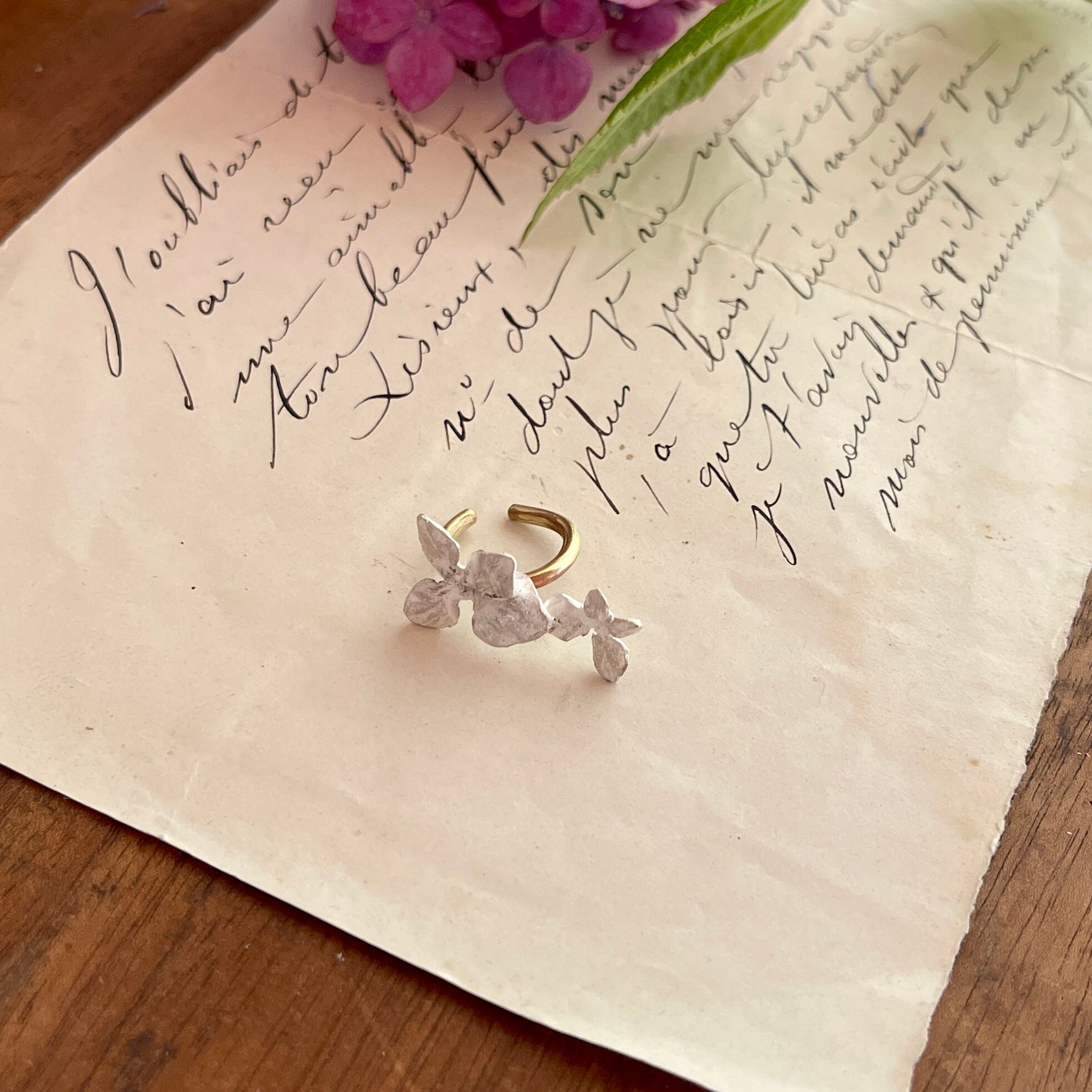 そのアジサイの花びらを模りイヤーカフに仕立てました