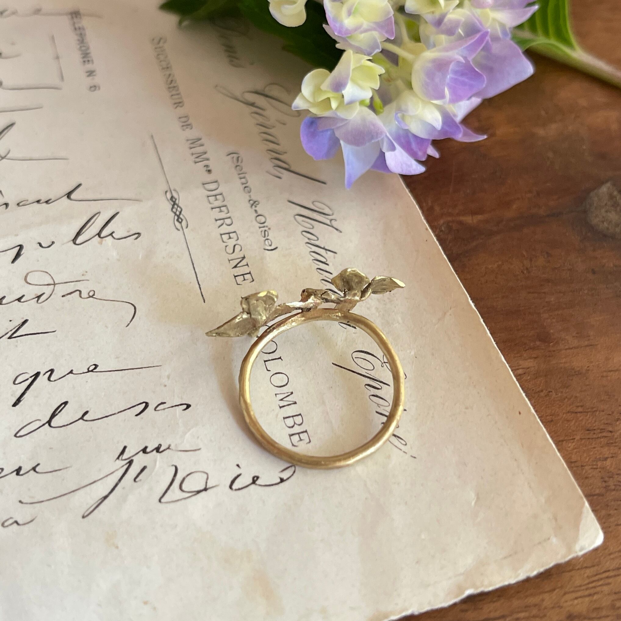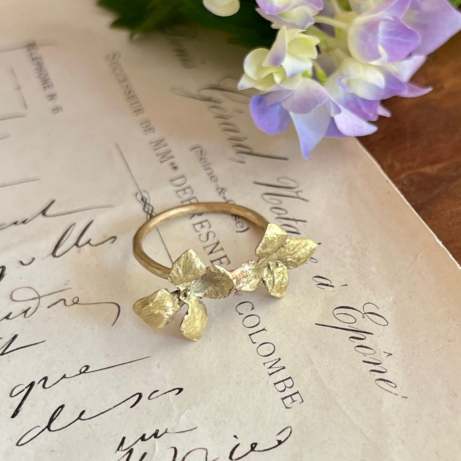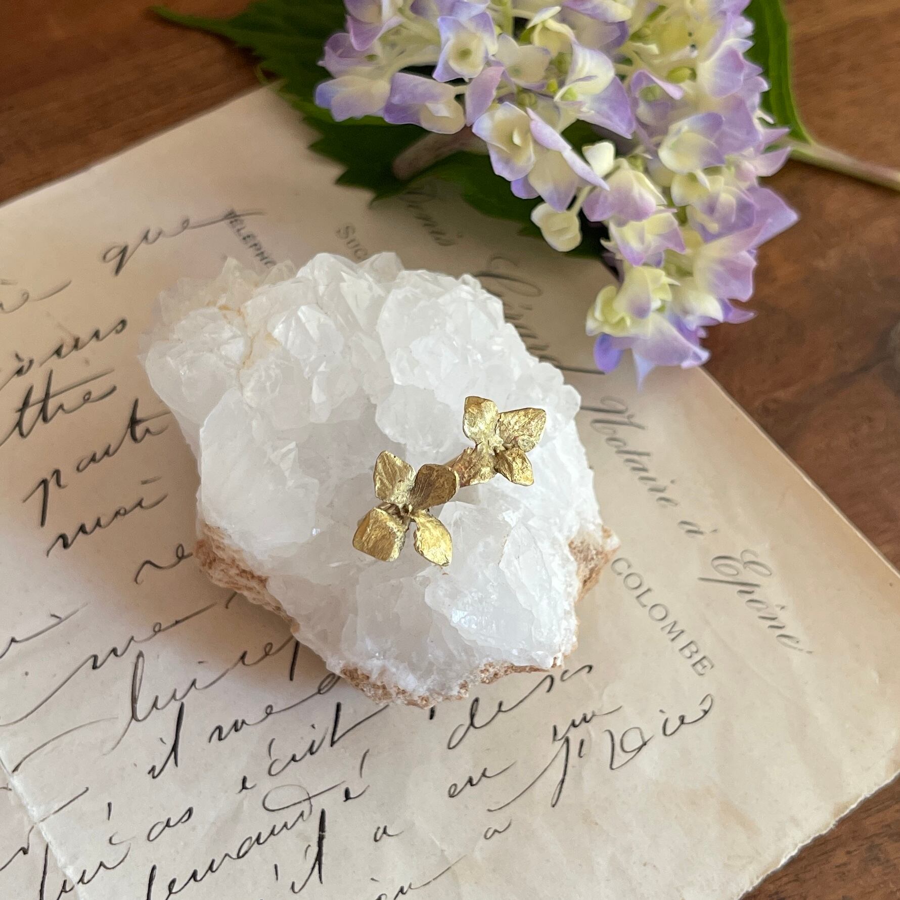 ブラス製の素材感が、上品でかわいらしいアジサイモチーフと相まって、女性らしい雰囲気を演出します